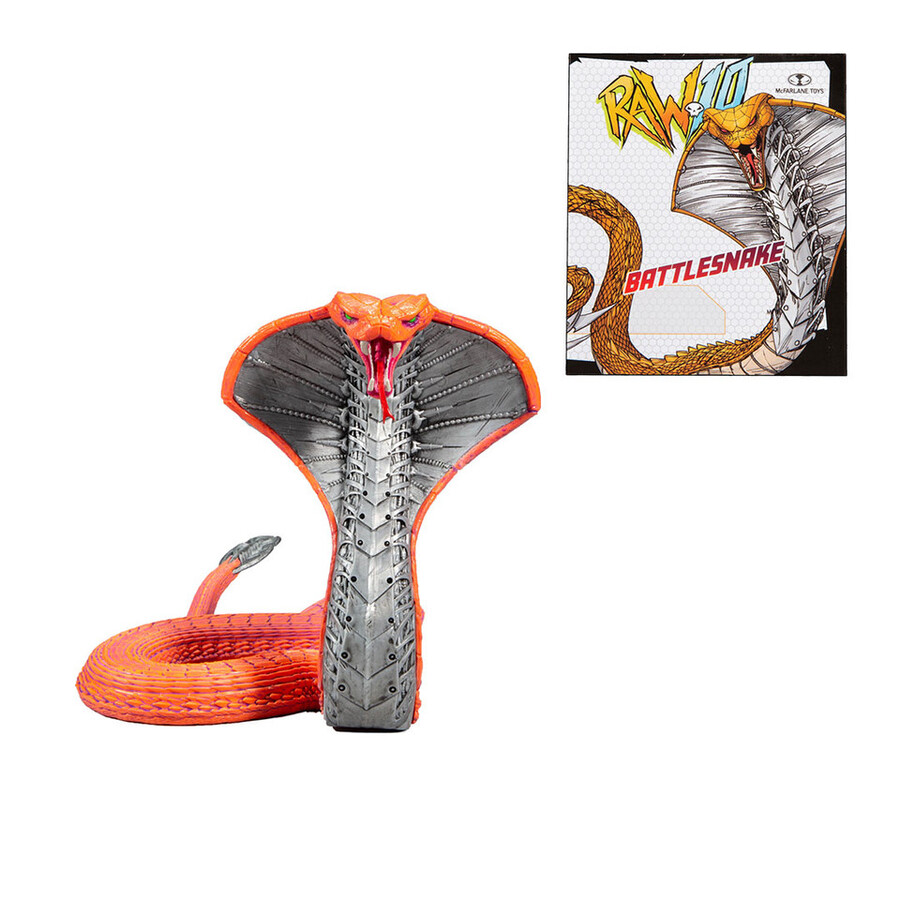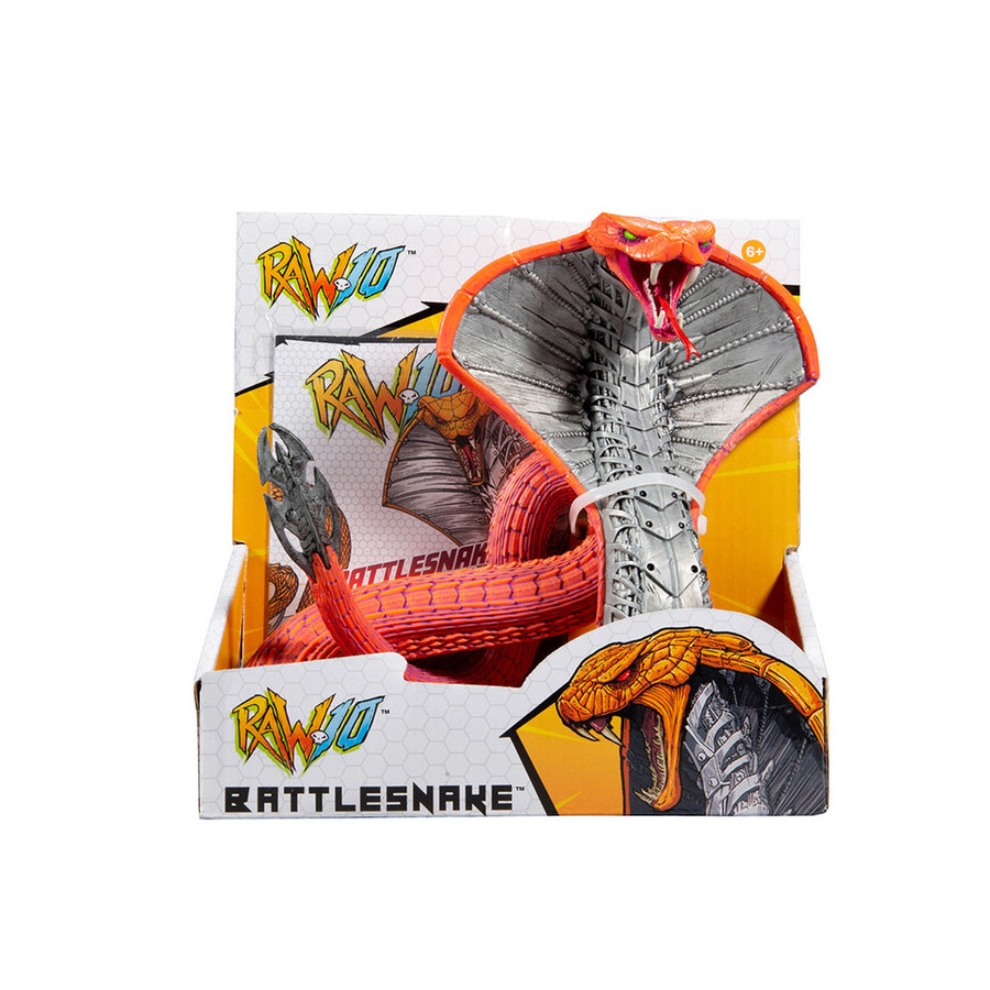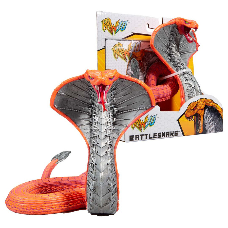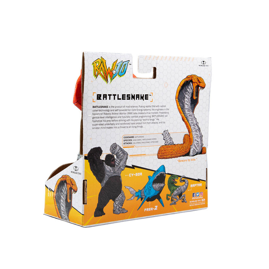 BATTLESNAKE is the product of mad science. Fusing reptile DNA with radical cyber-technology and self-powered Ion Core Energy systems, the engineers in the top-secret Robotic Animal Warrior (RAW) labs created a true monster. Possessing genius-level intelligence and futuristic combat programming, BATTLESNAKE can hypnotize his prey before striking with his piercing “techno fangs.” His super-steel underbelly and reinforced hood protect him from attacks, and his sinister mind makes him a threat to all living things. Battlesnake comes with a flexible tale, moveable jaw and articulated slide out tongue! Figure comes with a FREE mini comic poster. 7″ Action Figure.