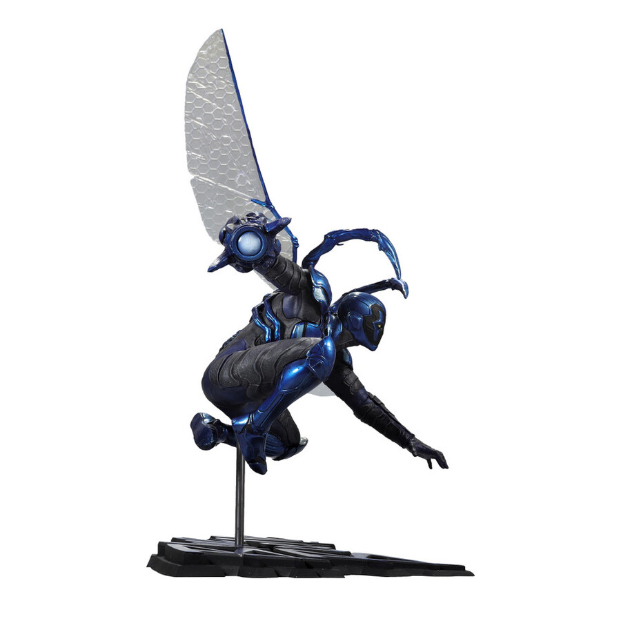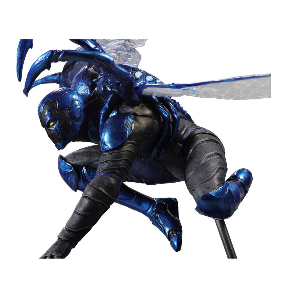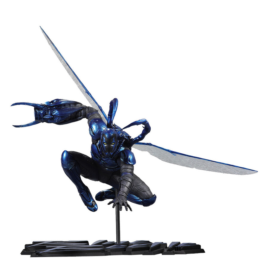 - Blue Beetle logo serves as the statue’s base.