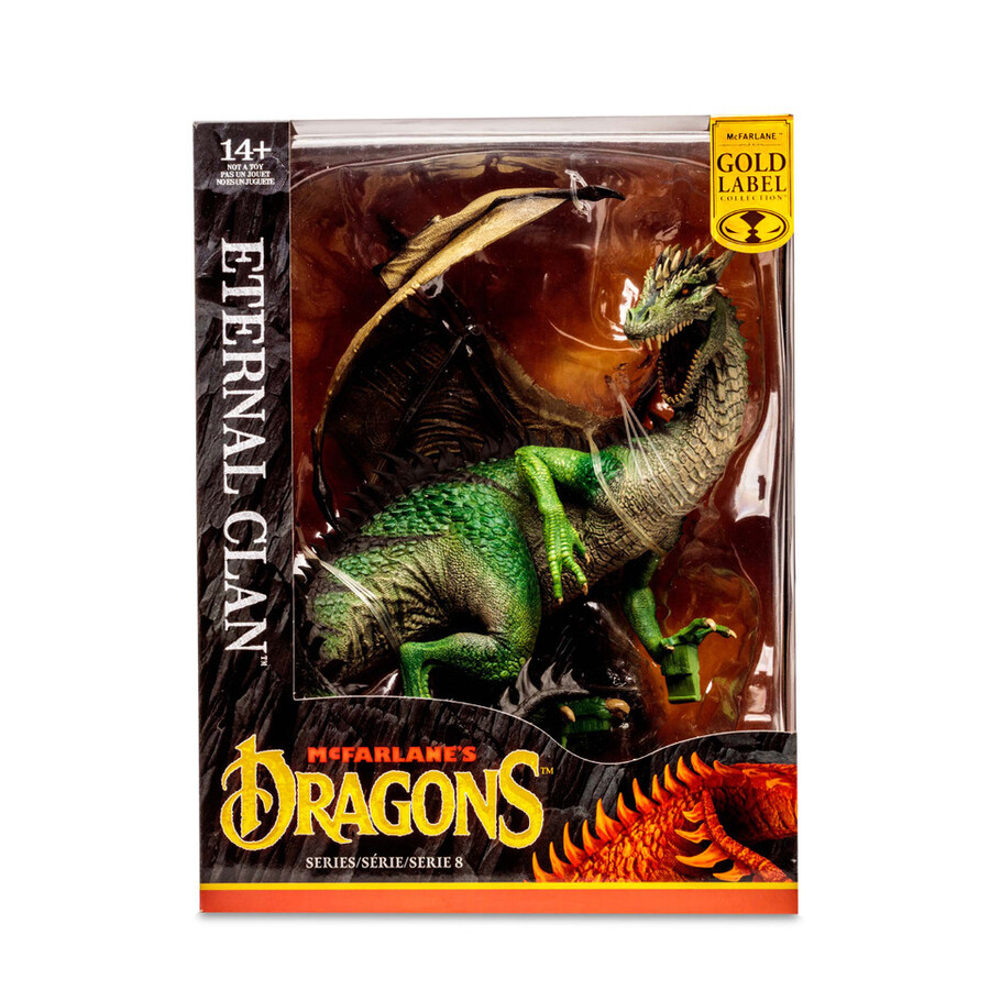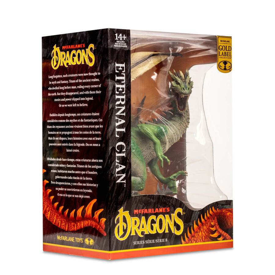 - Figure is showcased in New McFarlane’s Dragon window box packaging .