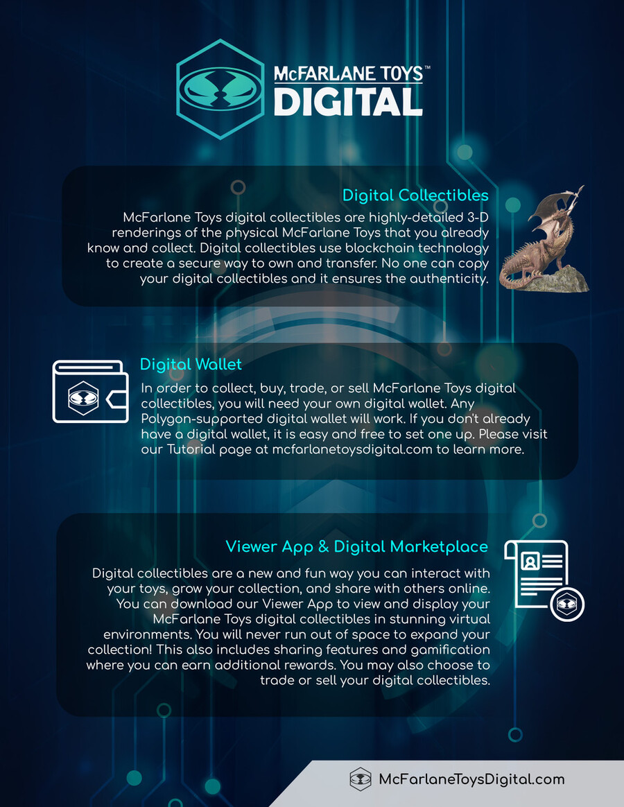 Each physical dragon figure comes with a digital collectible version, while supplies last. There are 4 different color variations. You will receive an email with instructions on how to redeem your Digital Dragon. More information on McFarlane Toys Digital.