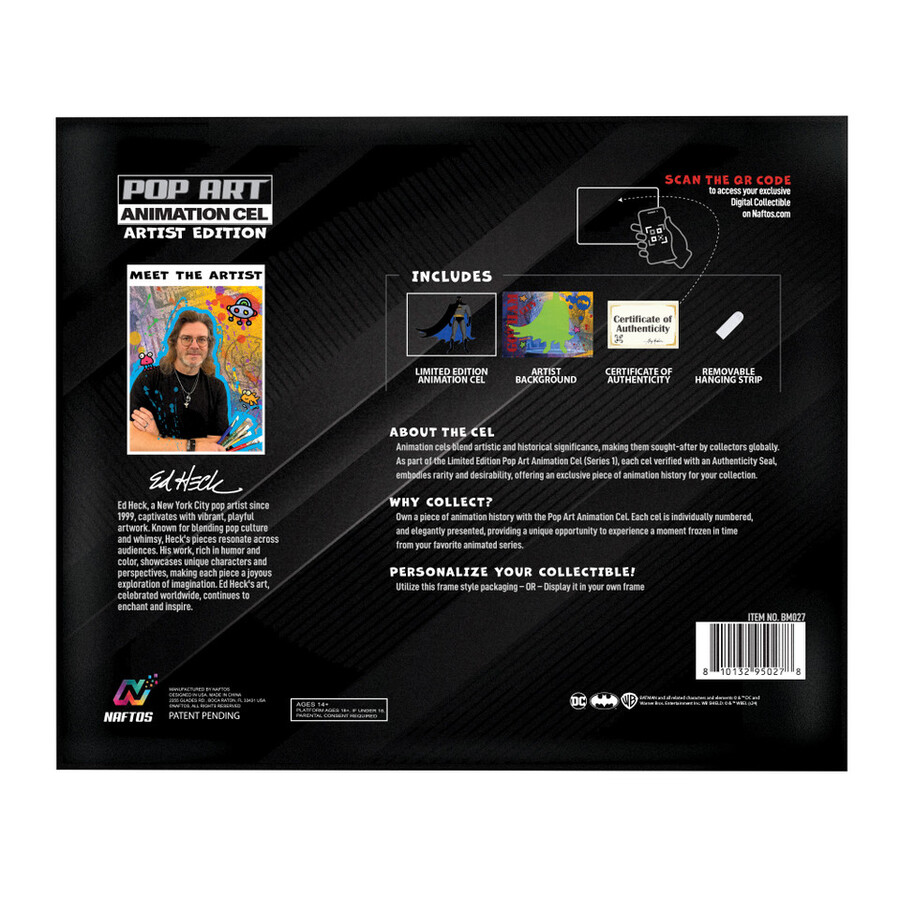 Product Description: Immerse yourself in the world of Batman: The Animated Series with our Exclusive Limited Edition Pop Art Animation Cel Collectibles. Each cel captures a memorable scene from the series, featuring a character cel from the episode and a background that has been artistically enhanced by a renowned artist. This collectible includes a digital twin, accessible via a QR code on the Certificate of Authenticity, combining physical and digital memorabilia. Perfect for fans and collectors, the cel arrives in a display-ready frame-style box with a holographic security seal for authenticity. Own a unique piece of animation history today! Components: (1) (8×10″) Animation Cel